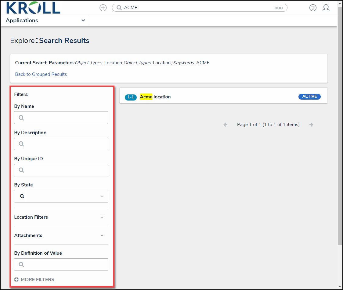 - The Search Results screen will refresh, listing a Filter section for the selected Object Type.